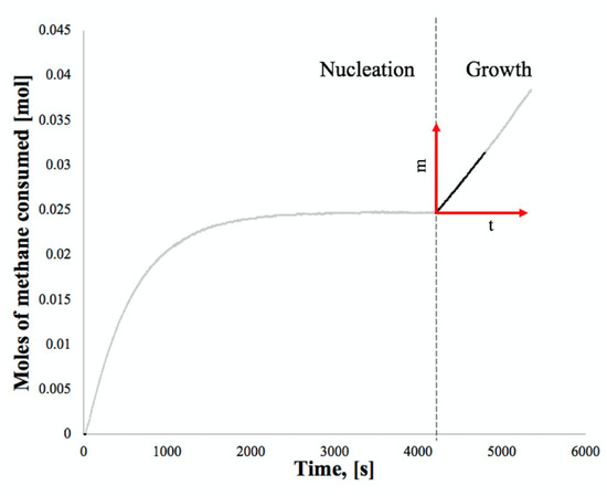 During methane hydrate growth experiments, as the stirring in the reactor is started and the experiment begun, we observe an initially high dissolution rate of the methane gas into the water/macrosurfactant solution. Over time, this dissolution rate decreases as the solution saturates. At the onset of nucleation, the methane hydrates are beginning to form and consume the methane in the solution allowing for more gas to dissolve into the liquid. As the hydrate growth crystallization process is linear, we observe a linear consumption of gas, an indication of the beginning of the hydrate formation process. The data collected for the initial growth rate of hydrate crystals are presented below in Figure 7.