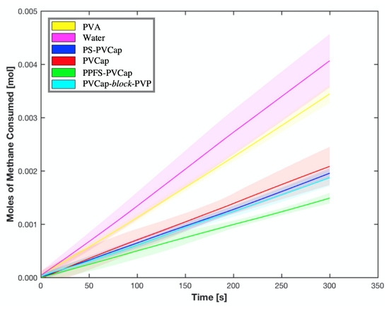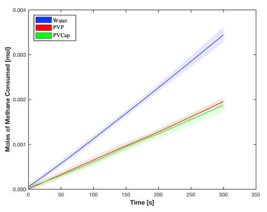 Figure 8 shows the initial growth rates of methane hydrates in deionized water as well as with the addition of PVP and PVCap homopolymer inhibitors. We observe a methane consumption rate of 1.14 × 10−5 mol s−1 for the aqueous system with no added inhibitors. This consumption rate was observed previously [14,27]. With the addition of PVP, we observe a 51% reduction in growth rate of hydrates with a methane consumption rate of 0.56 × 10−5 mol s−1. Conversely, by adding PVCap homopolymer as inhibitor, a 53% reduction in growth rate of hydrate is observed (methane consumption rate of 0.54 × 10−5 mol s−1). While both homopolymers exhibit comparable hydrate inhibition properties, PVCap shows more inhibition potential due to its stronger hydrophobic tendencies.