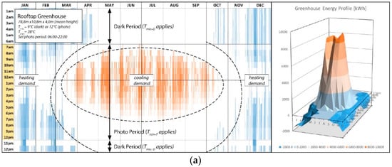The net sensible thermal energy extracted from this greenhouse depends on the desirable indoor temperature range, which in its turn is based on the produced crop type, the life-stage of this crop (i.e., germination or plant raising) or desired morphogenetic activity. The morphogenetic activity is in the model codetermined by the set photoperiod or natural sunlight. Initially, the photoperiod is set to 16 h per day for maximum crop growth and the minimum greenhouse indoor air temperature is set to 9 °C during dark period () and 12 °C during photoperiod () [55]. The initial cooling set-point is set to 28 °C () but can be reduced accordingly to meet the energy demand from the system. When annual crop yields are paramount, as is generally the case in industrialized intensive greenhouse farming, parameters such as relative indoor humidity, temperature of the root zone, indoor CO2 concentration are key aspects. However, they remain outside the scope of this energy-oriented study.