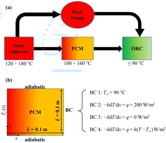 The Phase Change Materials (PCM)-solar-assisted Organic Rankine Cycle (ORC) scheme: (a) sketch of the thermal system; (b) detailed boundary conditions employed in the present paper.