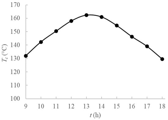 The collector fluid outlet temperature during the day is displayed in Figure 2, varying from about 130 °C to 160 °C, with maximum values achieved around midday, when the highest solar radiation is achieved. Sixth-order polynomial fits were employed to obtain an analytical function from experimental data from [25] to use as a boundary condition for the PCM domain.