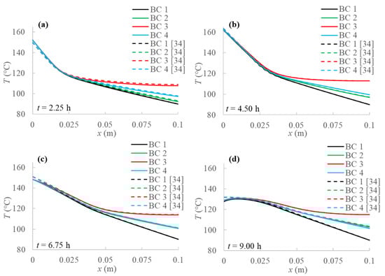 Comparison between temperature profiles for the 1D model [34] and the present 2D model without natural convection at different evaluation times: (a) after 2.25 h; (b) after 4.50 h; (c) after 6.75 h; (d) after 9.00 h from the simulation beginning respectively.