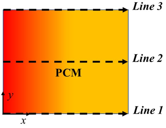 Scheme of the three different PCM transversal sections: Line 1 (y = 0 m); Line 2 (y = 0.05 m); Line 3 (y = 0.1 m).
