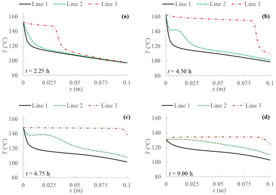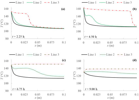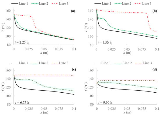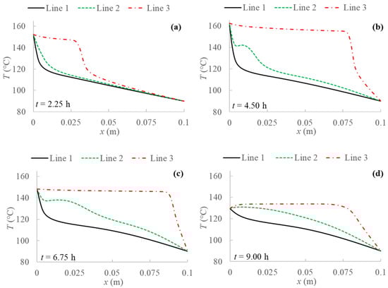 Temperature profiles for 2D model with natural convection and BC 4 evaluated at three different PCM transversal sections: Line 1 (y = 0 m); Line 2 (y = 0.05 m); Line 3 (y = 0.1 m), and at different evaluation times: (a) after 2.25 h; (b) after 4.50 h; (c) after 6.75 h; (d) after 9.00 h from the simulation beginning respectively.