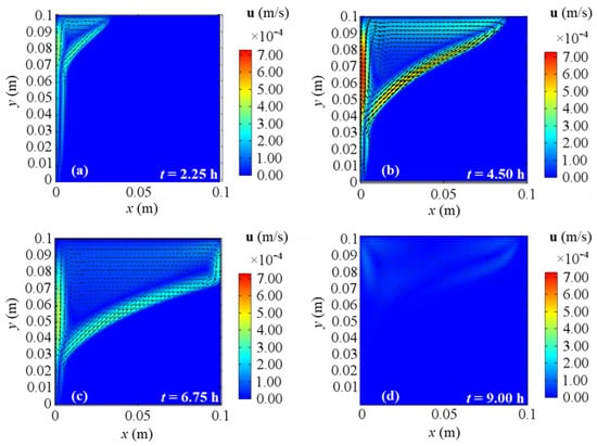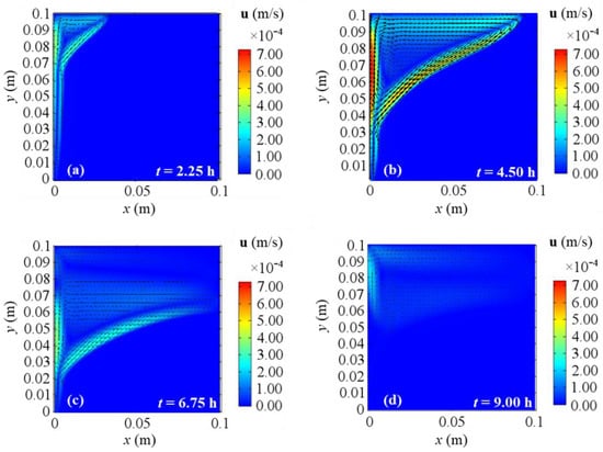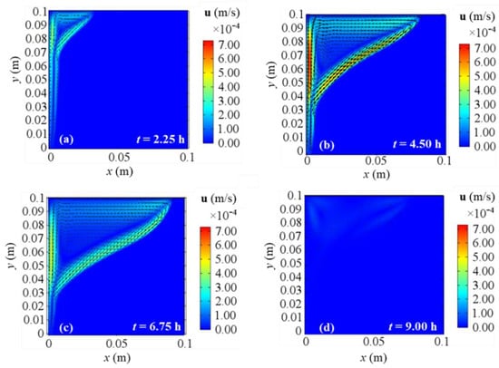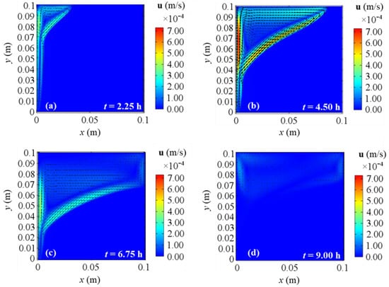 Velocity fields for 2D model with natural convection and BC 2 at different evaluation times: (a) after 2.25 h; (b) after 4.50 h; (c) after 6.75 h; (d) after 9.00 h from the simulation beginning respectively.