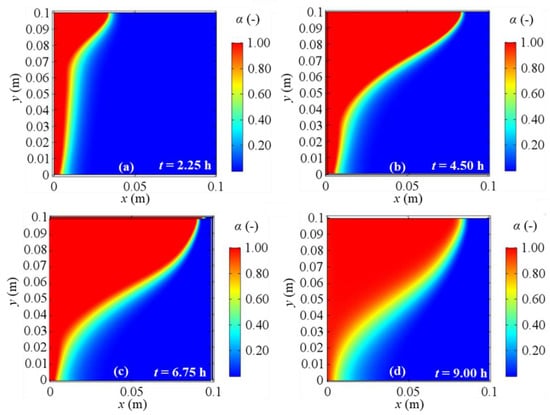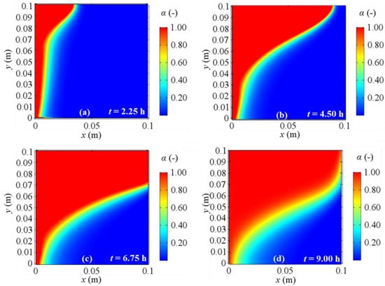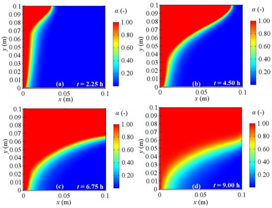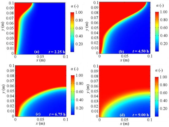 Melting fraction evolution for a 2D model with natural convection and BC 4 at different evaluation times: (a) after 2.25 h; (b) after 4.50 h; (c) after 6.75 h; (d) after 9.00 h from the simulation beginning respectively.