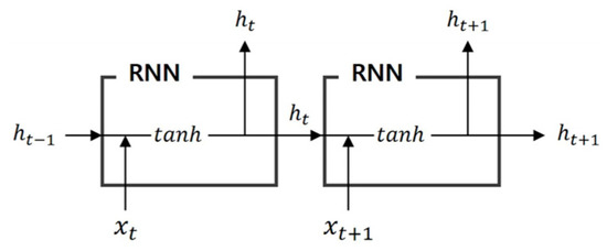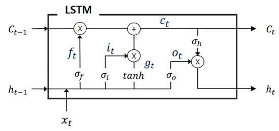 The hidden state is expressed by (37), where W and U are the weights of the input and the hidden state of the previous time , respectively, b is the bias, and is the nonlinear function (here, is a hyperbolic tangent). As the RNN progresses, a long-term dependency problem occurs owing to the gradient vanishing caused by the used nonlinear function. Therefore, the LSTM artificial neural network was designed and used in this study.