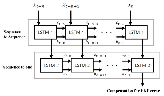 LSTM is an artificial neural network based on RNN, and it solves the long-term dependency problem using not only the hidden state but also the cell state as the input of the next time-step as shown in Figure 3. In the LSTM, the forget gate determines how much of the cell state from the previous time-step is reflected at the current time t. As the value passed through, the sigmoid function approaches 1, implying that the previous cell state is more reflected. The input gate is used to set the degree of the effect on the output of the current input, and it is represented by the Hadamard product of and . Here, because uses the hyperbolic tangent as an activation function, it has a value between −1 and 1. The equations related to the LSTM are given by (38)–(44), including the equations for , and , which are the outputs of the LSTM cell. In this paper, the study was conducted using the LSTM network of the two-layer architecture shown in Figure 4.