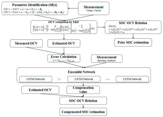 However, it is impossible to reflect the various factors that affect the battery dynamic behavior with their own time scales within one LSTM network. For example, having different time scales means that each of the factors affecting the battery behavior works with its own time length and respective time point. Thus, multiple networks with various LSTM cell numbers are required. Accordingly, in this study, we designed multiple LSTM structures and took a sort of ensemble average of them as network estimation results to compensate for the EKF results. The entire process used in the study is shown in Figure 5.