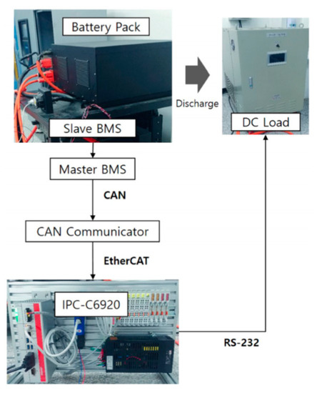 In the experiment, a Beckhoff IPC-C6920 PC and an Anybus CAN communicator were used, and the PC and BMS exchanged data through CAN and EtherCAT networks as shown in Figure 6. The DC load was connected to the PC via RS-232 serial communication to receive the current loading profile of the battery. In the battery pack, 10 slave BMSs and 1 master BMS measured the voltage, current, and temperature. Each slave BMS measured the battery pack status every 10 ms, and the master BMS transmitted data to the IPC-C6920 once every 100 ms. The performance of the used battery pack in the experiment is presented in Table 2.