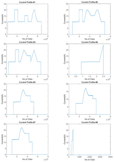 Therefore, in this experiment, model parameter estimation was performed just once in the initial state of each discharge. Then, SOC estimation was performed using only EKF and LSTM. In addition, the required data diversity for network learning was secured through 8 different current load profiles as shown in Figure 7. Accordingly, it was confirmed that the proposed method could accurately estimate SOC without real-time model parameter monitoring; Table 3 shows the estimated average model parameter values according to (12)–(14).