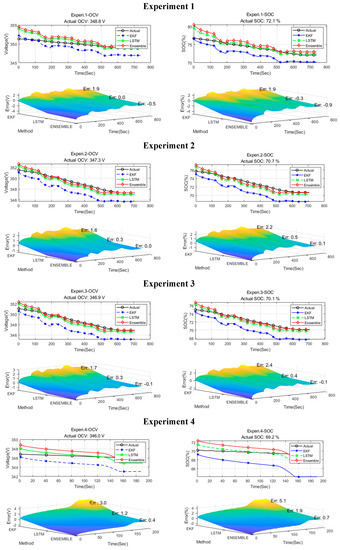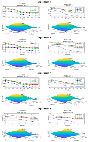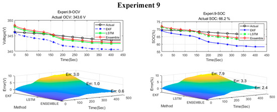 The root mean square error (RMSE) values of the nine experiments are presented in Table 4, and as seen in the table, the RMSE values of OCV and SOC were up to 3.0 V and 8.0%, respectively.