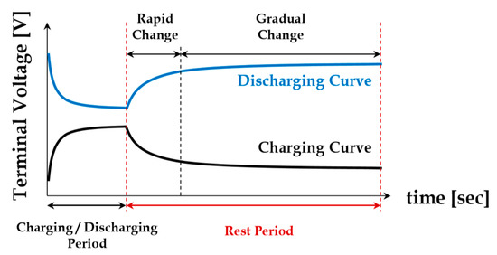 Finally, the method proposed in this paper is suitable for practical applications because it can accurately estimate the OCV immediately after discharging is over without having to wait for a rest period, which is usually required for perfect OCV measurements in the existing method, as shown in Figure 9.