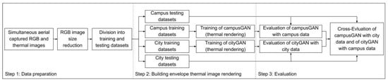 This study includes three steps: (1) dataset preparation, (2) building envelope thermal image rendering, and (3) evaluation. Figure 1 illustrates the research method workflow.