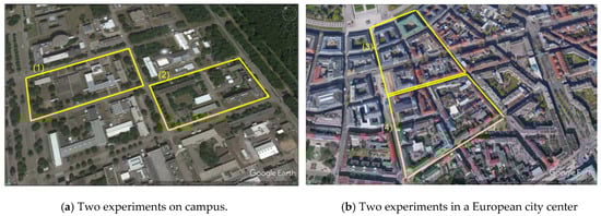In this study, we designed four experiments. Thermal and corresponding RGB images were taken from two separated areas on the campus area for experiments one and two, as shown in Figure 2a. These two experiments are abbreviated as “Camp1” and “Camp2”. Images were also taken from two separated areas in the city area for experiments three and four, as shown in Figure 2b and abbreviated as “City1” and “City2”.