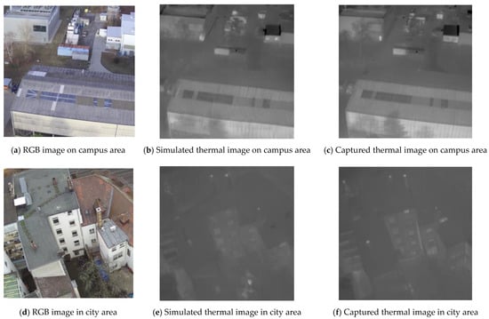 Despite the great success achieved by the previously described studies, deep learning algorithms are quite data hungry as demonstrated in many studies [,]. Data hunger refers to the size of the training dataset required for generating a model with a good predictive accuracy []. It is difficult for individual research groups to expand the training datasets because researchers are often unwilling to share data, or their data formats are incompatible. Therefore, researchers are forced to collect more data on their own. However, collecting data usually takes several days for a large district and is labor-intensive, costly, and inefficient []. Additionally, annotating these new acquired training datasets also requires many hours of labor and inspection for annotation accuracy. In order to solve the data hunger problem, some researchers have used synthetic data. For example, Chen et al. [] designed a framework to generate synthetic images from a 3D virtual environment. They simulated drone flight paths over the synthetic virtual environment (3D point cloud) that had annotated information such as the ground, buildings, and trees to render synthetic images with corresponding annotations. In their framework, depth images, which can be obtained by Lidar, and RGB images, which can be obtained by color cameras, in the real world were instead generated virtually. Data hunger also occurs with images that fuse RGB with thermal information. For example, Li et al. [] used thermal images taken outdoors and indoors on the ground to segment pedestrians, cars, tables, lamps, and other objects. This takes advantage of the thermal camera’s ability to capture information in dark and hazy environments. They also introduced synthetic thermal images to improve segmentation. Inspired by Li’s studies, we planned to use thermal information to improve the segmentation of aerial images of buildings outdoor scenes because it would allow us to capture different thermal signatures of each part of the building and its surroundings [,,]. Segmentation of building components has many benefits for energy analysis such as detecting building envelopes’ heat loss, moisture, and thermal bridges [,,]. It also allows for simulating energy consumption [,]. Therefore, generating synthetic thermal images as complementary information for RGB images could further improve the segmentation process.