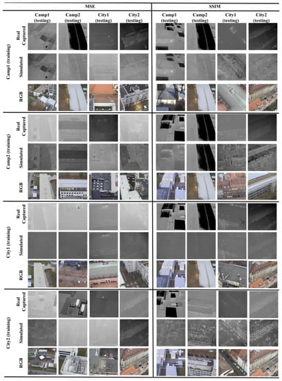 There were four experiments used in this study, abbreviated as “Camp1”, “Camp2”, “City1”, and “City2”. The evaluations were conducted on the testing datasets in the same experiment and between different experiments as shown in Table 1. Each row represents a GAN model that was built based on a training dataset in a corresponding experiment, and this GAN model processes a testing dataset in each column. The color in Table 1 represents the value of the number in a cell. According to the evaluation metrics, higher MSE values or lower SSIM values represent worse performance. Therefore, the red color represents higher MSE and lower SSIM values, namely worse performance. To represent better performance, the green color represents lower MSE and higher SSIM values, and the red color represents higher MSE and lower SSIM.