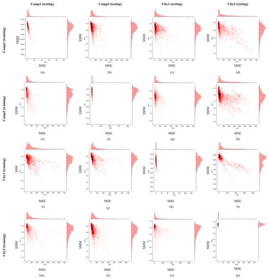 In order to understand the relationship between MSE and SSIM in terms of all images in an individual evaluation, we plotted several multivariate distribution figures for both the same and cross-experiment evaluations. In the same way that the headers are organized in Table 1, these distribution figures are plotted in Figure 5. In each distribution figure, the x-axis represents MSE value, and the y-axis represents SSIM value. Each image in the testing dataset has a MSE and a SSIM value, and a red point with a pair of MSE-SSIM coordinates is drawn in the distribution. The darker red area represents concentrated red points while the lighter red area represents scattered red points. There are some patterns observed in Figure 5. First, most figures illustrate negative correlations between MSE and SSIM values. Figures in the diagonal from upper left to lower right show robust negative correlations that red areas are very thin like a line with a strong negative coefficient. However, red points in other figures are scattered, which means such a performance is not stable. Second, if we observe the distributions in terms of MSE and SSIM values, respectively, we find that MSE values follow a long-tail distribution while SSIM values follow a Gaussian distribution in most evaluations. Third, distributions for the cases using a GAN model built with the city training dataset to process campus testing dataset are more stable than the cases in an inverse way. The reason is that distributions in Figure 5i,j,m,n are more stable than distributions in Figure 5c,d,g,h.