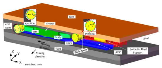 Coal is an important, globally relevant energy source to support industrial production and development and mining it safely and efficiently has been studied extensively [1,2]. As the key equipment in the longwall mining coalface, the shearer’s cutting and traction performance has been investigated [3,4]. With the continuous mining of coal resources, the reserves of thick and extremely thick coal seams that are easy-to-mine have been drastically reduced. Thin coal seams with a wide range of distribution and rich reserves have thus become the focus of coal energy development. Due to the influence of the mining height and geometry structure of equipment in thin coal seams, the coal shearer’s loading performance is extremely poor, causing float coal and the need to be cleaned manually by workers, which harms production efficiency and affects workers’ safety directly. Therefore, thin coal seam mining’s key goals are to improve drum loading performance promoting safety, and efficient exploitation.
