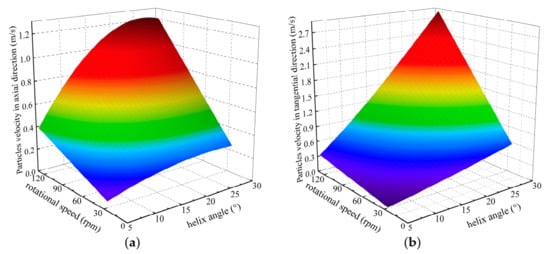 Figure 3a,b show the changes of the Va and Vt of particles with n and αcp of the helix vane, respectively. Figure 3 shows that as the rotational speed increased, particles’ tangential and axial velocity presented an increasing trend, but the change rate of tangential velocity was specifically greater than that of axial velocity. With the increase in the vane’s helix angle, particles’ axial velocity and increased first and then decreased and reached a peak near αcp = 26°. The tangential velocity of particles increased with the increase in the helix angle. Therefore, it can be understood that, although increasing the rotational speed can increase the axial fluidity of cracked coal particles and facilitate the conveying of particles from depths of the coal face. Meanwhile, the rotational speed’s influence on particles’ tangential velocity was more obvious, especially at a larger web depth, which increased the possibility of particles being thrown into the shearer track and reduced the drum’s loading rate.