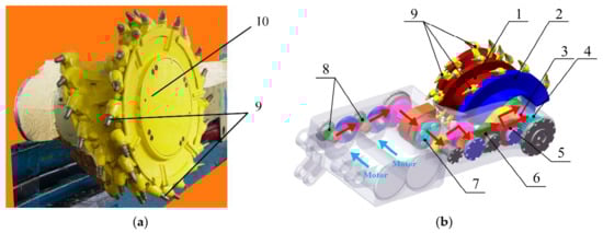 (a) Actual shearer drum; (b) The ranging arm with two-segment differential rotational speed drum (TDRSD). 1. Front drum; 2. Rear drum; 3. Drive gear of rear drum; 4. Drive gear of front drum; 5. Bearing; 6. Idler wheel; 7. Planetary gear train; 8. Motor gear; 9. Conical pick; 10. Single drum.