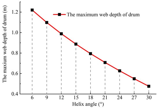 According to Equation (9), the maximum web depth curve with the average helix angle αcp can be drawn, as shown in Figure 6. Figure 6 shows that, with the continuous increase in helix angle, the maximum web depth J that satisfied Equation (9) was continuously reduced. Therefore, to ensure a certain web depth was unchanged, the only approach was to reduce the helix angle, which would cause an increase in the wrap angle. [5] proved that the larger wrap angle had a negative impact on coal loading performance by field tests. Because of the above analysis, based on a differential drum and combined Equation (9), the front drum was far away from the conveyor and with a larger web depth, so a smaller helix angle was adopted; the rear drum was near the conveyor, and with a smaller web depth, so the larger helix angle was utilized.
