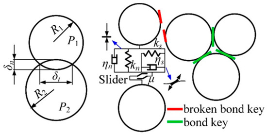 In DEM, the Hertz–Mindlin (HM) no-slip model was the basic model between particles. In order to model the coal face before being crushed, the particles should be glued. Therefore, the Bonded-Particle Model (BPM) [38] was used as the particle bonding model to prevent the coal face from collapsing, as shown in Figure 7. The HM contact and BPM models were expressed as Equations (10) and (11), respectively.