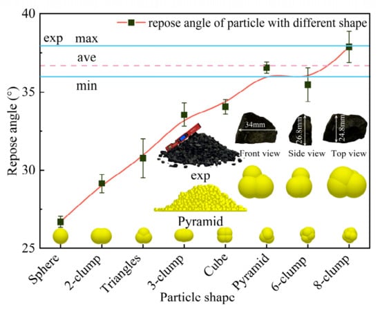 In the DEM numerical modeling, because of the simple ball shape and few contact surfaces between particles, which cause the higher computing efficiency and shorter simulating time, the spherical particle is popular and widely utilized in many engineering fields. However, the spherical particle has a disadvantage and cannot be ignored, that is, the contact between particles is point-to-point contact mode; the sliding friction almost has no effect on the movement of particles. Therefore, there is a fascinating point that the sliding friction coefficient of the spherical particle was generally set to be greater than 1 in DEM, which is unlikely in actual practice, to achieve the consistency of the macro phenomenon [39,40]. The shape has an important impact on the movement of particles [41], and the shape of excavated and cracked coal particles are rarely spherical, so we compared the results of the repose angle between real coal particles and particles with a different shape in DEM, and finally determined the particle shape utilized in DEM modeling. The calibration of particle shape in DEM was taken with the particle calibration method’s repose angle test method [41]. The real friction coefficient between coal–coal and coal–steel measured by [42] was used in DEM. Meanwhile, the dimensions of broken coal particles excavated by thin coal seam shearer are 25–40 mm, so the particles with approximately uniform dimensions around 30 mm were selected to take laboratory’s repose angle experiment. The experiment repose angle was obtained through multiple tests and measurements. Comprehensively considering the computational cost and accuracy of numerical results, the dimensions of particles in DEM was also determined to around 30 mm, and particles’ dimensions and the comparison of the repose angle between the experiment and different particle shape in DEM is shown in Figure 8.