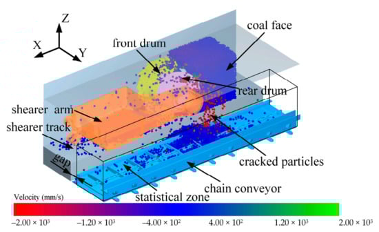 By comprehensively analyzing and comparing Figure 11a,c, we see that with the increase in nR, the VX of particles in area 6 increases slightly, while the VZ increases intensively. The main reason causing this phenomenon is that the cutting direction was from floor to roof, with the drum rotation axis’s height as the criterion. The vanes acted on the particles whose position was lower than the horizontal height of rotation axis of drum, the component in the tangential velocity in the X-direction was the same as the hauling direction. However, for the particles higher than the criterion height, the X direction’s tangential velocity was precisely the opposite. Considering that the number of particles in the upper and lower parts was basically the same, the X-direction’s velocity was opposite, so the rotational speed’s changed had no evident impact on velocities in the X-direction.