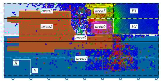 To investigate the effect of differential drum on shearer loading performance and the coal loading mechanism of TDRSD, the coal face was divided into two equal parts, P1 and P2, according to the different web depth. P1 was far away from the conveyor with a larger web depth and P2 was near the conveyor. Meanwhile, to investigate the distribution of the particles under the action of TDRSD, the distribution area was divided into six statistical areas: the goaf of the shearer track was divided into two areas, which were area 1 and area 2, area 1 and P1 were parallel area 2 and P2 were parallel; the gap between coal face and conveyor was area 3; the conveyor was area 4,which is the actual effective loading area; area 5 and area 6 were the front drum and rear drum, respectively, shown in Figure 10. The rotational speed of the front and rear drums were represented by nF and nR, respectively.