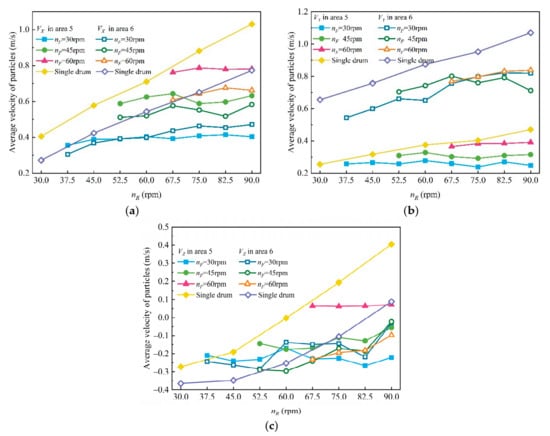 Comparing the Z-direction (VZ) velocity between particles in area 5 and area 6, it can be observed that VZ in area 5 was greater than that in area 6, especially under greater rotational speed conditions. The main reason was that the rear drum adopted a single vane structure, and the particles were less agitated by the vanes, so the value of VZ in area 6 was less than that in area 5.