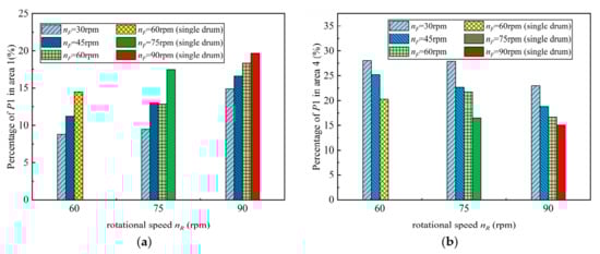 Figure 16 showed the difference of coal loading rate between the single and TDRSD under the same nR (60, 75, and 90 rpm). Figure 13b indicated that the value of P1 in area 4, namely, the loading rate of particles in P1. Comparing Figure 13b and Figure 16, and combining with Table 4, the particles in the P1 area were extremely significant factors affecting the difference of coal loading rate between single and TDRSD in the conveying process. Meanwhile, the above analysis was verified again; in the process of particles’ conveying, the lower nF had a positive impact on particles remaining in the envelope zone, and properly increasing nR was conducive to enhancing the particles’ ejection effect. Through the overall analysis of the matching relationship of rotational speed between the front and rear drum, in the view of particles loading performance, the front drum should adopt a lower rotational speed as far as possible, and the rear drum rotational speed should be guaranteed in the range 60–67.5 rpm, which allows the drum to work at the optimal loading performance.