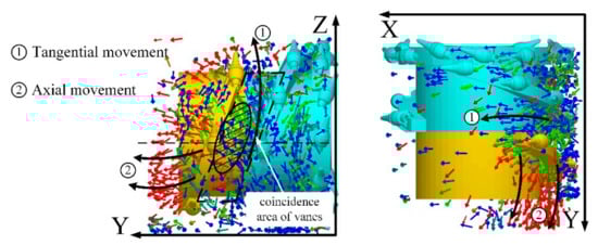 Figure 13 showed the distribution and percentage of particles of P1 in area 1 and area 4 with a constant nR, respectively. By keeping the nR constant in different simulation cases, the influence of different nF on particles’ motion behavior in P1 was investigated, and the loading mechanism of different rotational speed matching was revealed further. As indicated in Figure 13a, the value of P1 in area 1 had an evident difference with the different nF under the condition of nR was 60, 75, and 90 rpm, respectively. The P1 value in area 1 increased with the increase in nF in the same nR; the reason for that was the higher of nF was, the more pronounced the effect of front drum throwing particles into goaf could be approximately considered, which was consistent with the previous conclusion. An interesting point was found in nR = 75 rpm; the P1 value of nF = 45 rpm was slightly greater than that of nF = 60 rpm, which was contray to previous conclusions. The main reason for this phenomenon may be that the structure of the vane in the rear drum was a single vane, while the front drum was a double vane; therefore, the single drum of the rear drum with nR = 75 rpm could be equivalent to a double vane with nR = 37.5 rpm, which was greater than the front drum nF = 30 rpm and was the closest to the front drum nF = 45 rpm. As mentioned above: the circumstance of nR was greater than nF, the screw vane of the rear drum will rotate to the anterior of the front drum vanes, leading to a larger space behind the front drum, and the particles flowed axially to envelop zone of the rear drum. Under the equivalent conditions, nR was less than that of nF, especially the rotational speed difference between nF and nR was not obvious, the vanes of front drum and rear drum had a considerable part of the coincidence area, where the vanes of rear drum blocked particles flow, and the axial velocity of particles decreased sharply. It can be seen through the velocity vector that even the direction of some particles in the axial direction was reversed, as indicated in Figure 14. Figure 13b shows that nF = 30 or 45 rpm, nR increased from 60 rpm to 75 rpm, and the change of P1 value in area 4 was not significant, which proved that the influence of the rear drum on particles that far away from the conveyor was not evident. The main reason for the above was that the particles conveyed from the front drum to the rear drum’s envelop zone, were packed at the bottom of the rear drum mostly, although the rear drum with a higher nR hardly impacted on the particles at the bottom.