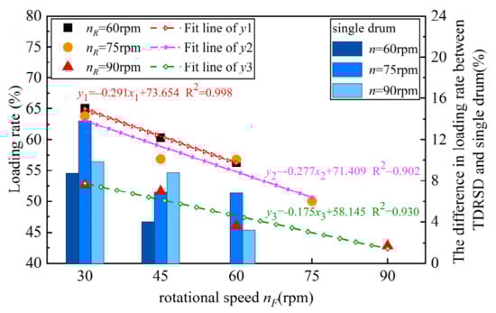 Based on the analysis above, the rotational speed had an important impact on particle velocity, motion path, and particle distribution; consequently, the influence of rotational speed matching between the front and rear drum on loading rate was also investigated.