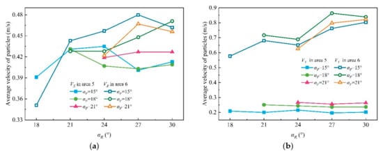 Figure 11 shows that, in area 5, with the increase in nR, the changing velocity of particles in the X-direction (VX) was not obvious under the same nF; whereas the VX of particles increased slightly with the increase in nR, in area 6 which illustrated that the increase in nR had no obvious effect on the velocities of particles in the front drum in the X-direction. Figure 11a shows that the VX of particles in area 5 was significantly greater than that in area 6; the main cause that led to this result would be the endplate’s existence in area 5. The friction of vanes had no impact on the particles excavated by picks of the endplate, so the particles could get a larger tangential velocity, which causes a bigger VX of particles in area 5 than in area 6.