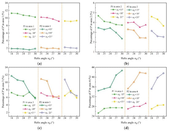 The distribution of particles in P1 and P2 in different statistical areas are shown in Figure 18. Figure 18a shows that the value of P1 decreased with the increase in αF when the αF was less than 24°. In addition, the P1 value in area 1 was greater than that before optimization (αF = 24°), and the primary reason for that was the helix angle of the front drum was small, which lead to a larger wrap angle, which further leads to the larger coincidence area of double-vane. The particles did not flow easily or axially within the front drum’s envelop zone and became a circulation coal. Therefore, the P1 value in area 1 increased with the decrease in αF.