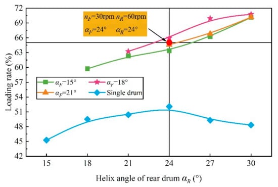 Considering Figure 15 and Figure 19, Table 5 and Table 6, the rotational speed matching relationship between front and rear drum had a more significant impact on loading performance than the helix angle matching. Considering the loading performance, in the process of drum design and rotational speed matching of TDRSD, the nF should be kept at about 30 rpm, and that of nR should be kept in the range 60–67.5 rpm. Based on the TDRSD, the helix angle matching between the front and rear drum was optimized, and the αF should be about 18° and the value of αR should be larger for optimal loading performance.