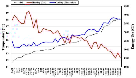 Climate models are inherently uncertain. We can, however, generate snapshots of what it might look like. In addition, the process of propagating the climate uncertainties is not absolute and comes with uncertainties with regard to the selection of appropriate parameters and models. Figure 2 reflects the dry bulb temperature (DB) for each weather file to reflect the impact of climate change on the current and future weather files and shows the results of heating (HeatingGas) and cooling (CoolingElec) energy use of the sample office building when EnergyPlus simulation is conducted for each weather file.