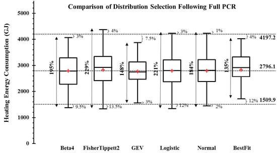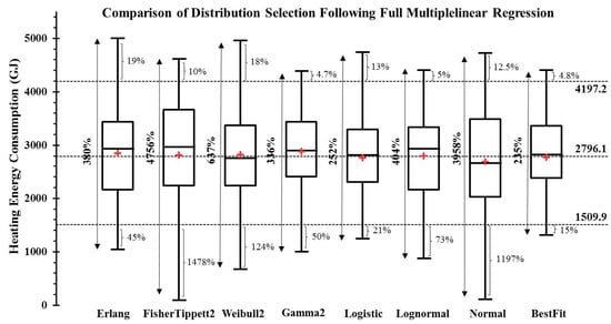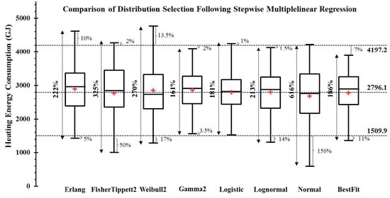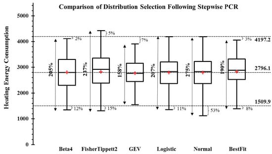 Figure 6 and Figure 7 show the results of heating distributions following full multiple linear regression and stepwise multiple linear regression respectively and compare the selection of different input distributions in the uncertainty propagation method.