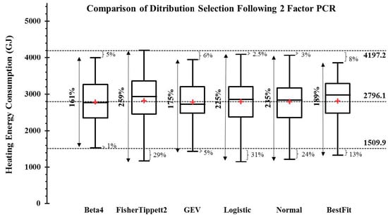 Figure 8, Figure 9 and Figure 10 show the heating energy use distribution when following a PCR, a stepwise PCR and a 2 factor PCR when selecting various input distributions of principal component variables in the uncertainty propagation method respectively.