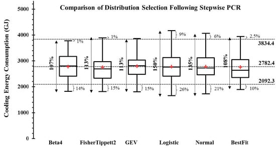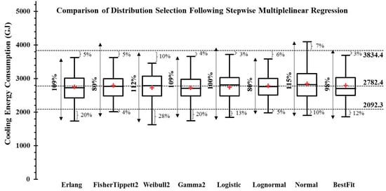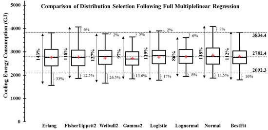 From Figure 11 and Figure 12 the average cooling energy use distributions show a close fit to the mean simulated data. In addition, the percentage changes between the max and min of the cooling energy distributions are relatively smaller than what was shown for heating energy consumption (Figure 6 and Figure 7). This is also apparent in the average and sum of all mean absolute errors of the series for both regression models shown in Table 4. Figure 11 and Figure 12 smaller variations can be seen in the lower and upper bound of the cooling energy use distribution from actual simulated data compared to heating energy use results presented in Figure 6 and Figure 7. The BestFit distribution, compared to most series of both regression models show relatively smaller percentage change of max and min of the distribution and smaller variations between the lower and higher bound compared to the simulated data.