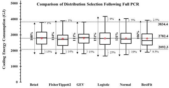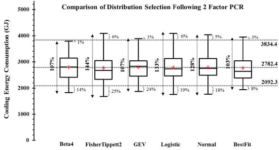 Figure 13, Figure 14 and Figure 15 show the results of cooling energy use when propagating uncertainties following the principal component regression models on various input principal components distributions.