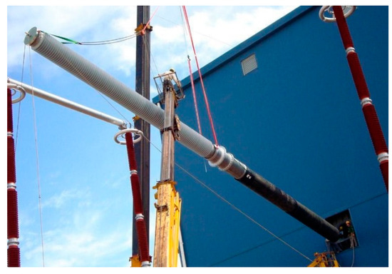 With the increased demand of power loads, large-capacity power transmission over long distances has developed rapidly in recent years [1,2]. In the meantime, with advances in technology, DC transmission is getting more and more attention from researchers and engineers. Especially when the transmission distance is greater than the economic distance, DC transmission shows a clear advantage in the economical way [2]. However, the higher DC voltage imparts longer DC wall bushings. A ±800 kV DC wall bushing with a length of 21 m is shown in Figure 1. For DC ± 1100 kV ultrahigh voltage transmission projects in China, the length of a bushing reaches up to 30 m [3]. Therefore, a supporting insulator is needed to keep the conductor straight and consequently makes the field distribution inside the bushing more uniform. Meanwhile, charge can accumulate on the insulator surface for long-term operation under the DC electric field [3,4,5,6,7,8]. The electric field generated by the surface charge can distort the initial field and possibly increase the risks of partial discharge or flashover [9,10].