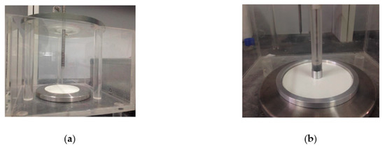 Figure 2 shows the testing system designed for measuring the surface potential. A transparent PMMA (polymethyl methacrylate) open box (300 × 300 × 200 mm) was made with a metal base plate (diameter = 150 mm) on the subface that could be connected to the ground. The probe that connected to the electrometer was fixed to the guide rail and kept vertical to the plate. The gap between the probe and sample was set at 2 mm. The measuring error can be limited within 2% when the gap distance is no more than 3 mm, beyond which the measuring error becomes dramatically higher [13]. The gap distance of not less than 2 mm could effectively avoid discharges between the sample surface and the probe [14]. The rail was marked with a scale, the measuring accuracy of which was 1 mm, adjusted continuously by rotary knobs. In this way, the probe could cover the whole area of the sample with the assistance of the guide rail.