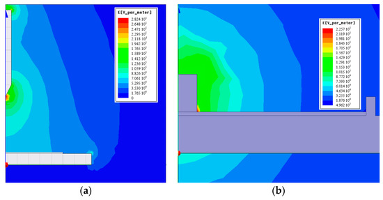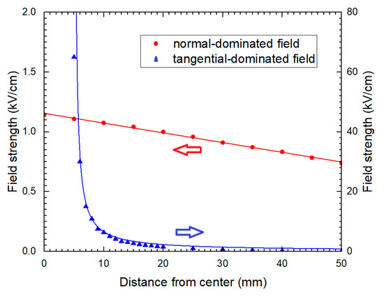 Electric field distribution when −5 kV was applied for (a) normal-dominated field; (b) tangential-dominated field.