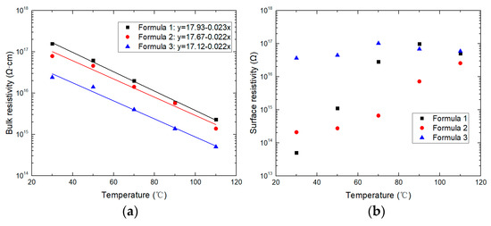 Bulk and surface resistivity as a function of the temperature from 30 to 110 °C were illustrated in Figure 6. The logarithm of bulk resistivity was negatively correlated to the temperature linearly within the investigated temperature range. From room temperature to 110 °C, the bulk resistivity was 20-fold lower. The temperature dependence of the bulk resistivity revealed little difference among the three formulas, as shown by the fitting results in Figure 6a (black for formula 1, red for formula 2 and blue for formula 3). Different from the bulk resistivity, surface resistivity is related not only to the properties of the material but also to the interfacial characteristics. In general, the surface resistivity is high for dry and clean dielectrics. It becomes lower mainly because there is moisture or impurities adsorbed on the surface [2]. Besides, the effect of surface trap distribution is an important factor in surface electron migration [21]. As a result, with the increase of temperature, the variation trend of surface resistivity was complicated. In general, it was larger at higher temperatures.