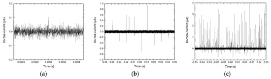Corona current measures under the applied voltages of (a) −1.0 kV, (b) −2.8 kV and (c) −4.8 kV.