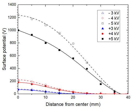 Surface potential distribution was measured and shown in Figure 8. It was found that when positive/negative voltage was applied, there was only positive/negative surface potential. Based on that, the surface potential under negative voltages was transformed into an absolute value for a side-by-side comparison. It has to be noted that surface potential is not proportional to the surface charge density [15]. That is, we could make a qualitative judgement about surface charge accumulation with the surface potential distribution, but it is not sufficient to derive the qualitative charge distribution directly.