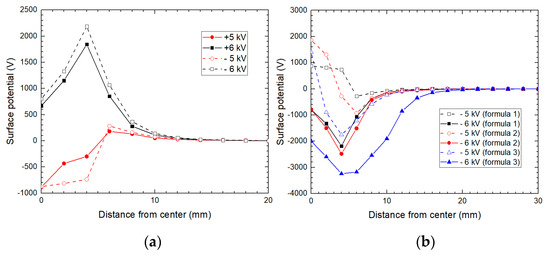 Surface potential distribution after exposed to a tangential-dominated DC electric field for 10 min at 30 °C of (a) Formula 1 under different voltages (surface potential under negative voltage was taken the opposite for the convenience of comparison); (b) Formulas 1–3 under different voltages.