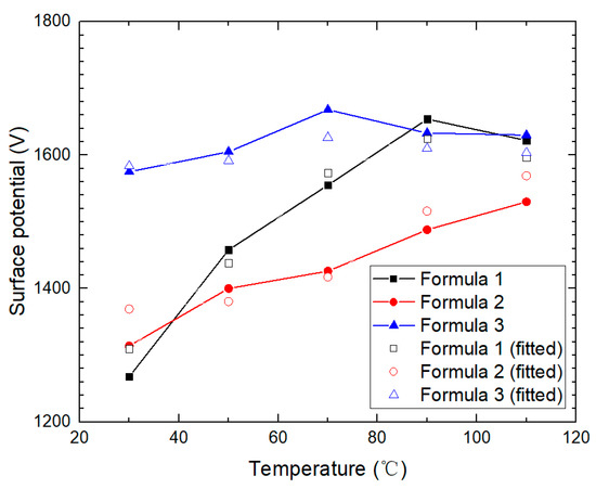 Measured and fitted surface potential values at the center of three formulas after being exposed to a tangential-dominated DC electric field for 10 min at different temperatures (the voltage applied was −5 kV, which means the potential had been saturated).
